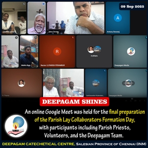 An online Google Meet was held for the final preparation of the Parish Lay Collaborators Formation Day, with participants including Parish Priests, Volunteers and the Deepagam Team. Participants included Fr. Stanislaus, Fr. Jesudoss, Fr. John Christy, Fr. Francis Pinto, Fr. Thamathiruthuvam, Fr. Sathiaseelan and several others.